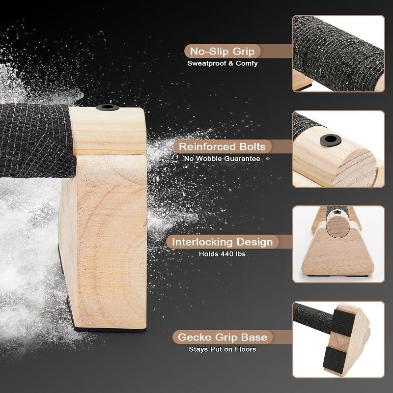 - Stabiler Stand & rutschfeste Oberfläche – sichert festen Halt bei Push-ups, L-Sits, Dips oder Handstand-Übungen.